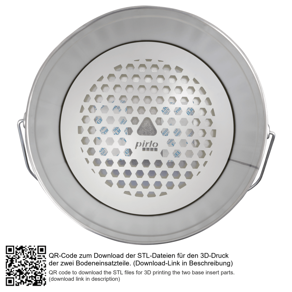 Scope of delivery: Metal buckets with metal handle, lid with integrated thermometer and hygrometer, O-ring seal, 100 g desiccant bag, STL-files for 3D-printing of the two base insert parts (download with QR-code or link: https://stratus.pirlo.com/index.php/s/MfBcyAGdj4CYotR)
