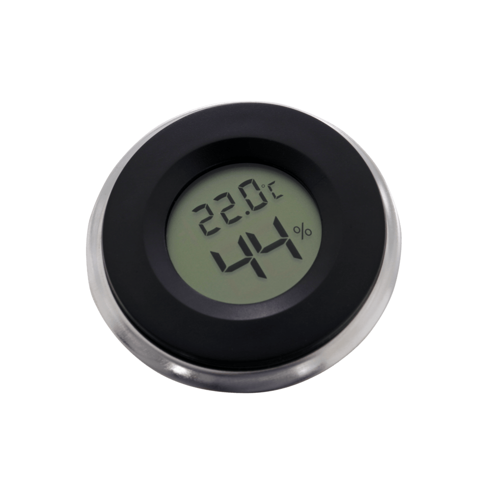 The thermometer and hygrometer integrated in the air-impermeable lid is used to control the temperature and humidity inside the container. The shown base insert can be printed on your 3D printer using our 3D print file. The included desiccant bag is placed inside the bucket to remove any moisture.