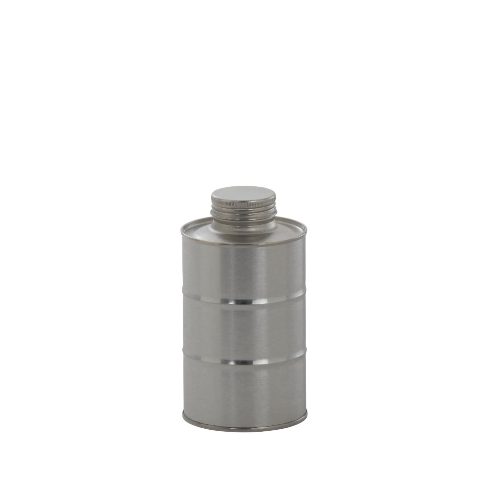 Extraordinary round screw-cap bottle with oil drum look in a modern industrial design and elegant silver finish. Unique and eye-catching metal packaging for your high-quality, dry food products, like coffee beans, coffee powder, rice, grain, protein powder or cocoa, also as customer gift or give-away. The robust mini drums are sustainably produced in Austria, unbreakable, impermeable to light and air and are equipped with a seal in the screw-cap, offering optimum protection for your valuable filling goods. If you opt for metal packaging, you are also doing something good for the environment: metal packaging made of tinplate is 100% recyclable if disposed of properly.
