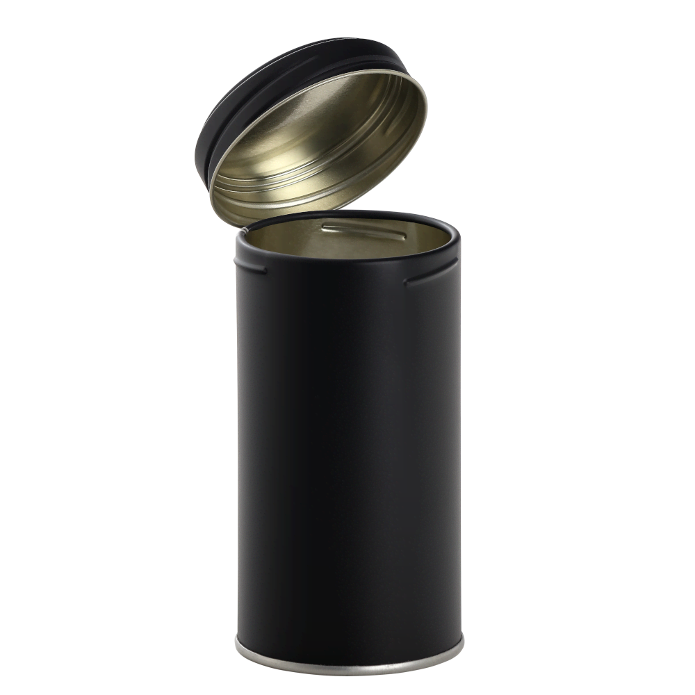Round cans made of metal/tinplate inside BPA-NI in a modern black matt design with screw-cap, optionally with aroma inside cover. Elegant packaging solution for your high quality spices, herbs, teas and other dry food products. The robust and sustainable metal container is inside BPA-NI, unbreakable and impermeable to light and air, offering optimum protection for your valuable filling goods. If you opt for metal packaging, you are also doing something good for the environment: metal packaging made of tinplate is 100% recyclable if disposed of properly.