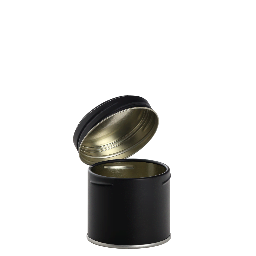 Round cans made of metal/tinplate inside BPA-NI in a modern black matt design with screw-cap and spice shaker insert. Elegant packaging solution for your high quality spices, herbs, teas and other dry food products. The robust and sustainable metal container is inside BPA-NI, unbreakable and impermeable to light and air, offering optimum protection for your valuable filling goods. If you opt for metal packaging, you are also doing something good for the environment: metal packaging made of tinplate is 100% recyclable if disposed of properly.